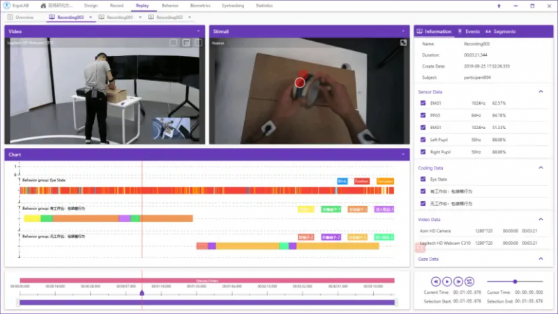 ErgoLAB人机环境同步平台采用主客观结合多模态数据同步采集与多维度验证的方法,数据实时同步种类包含大脑认知数据(EEG/BCI脑电仪与脑机接口边缘计算设备、fNIRS/BCI近红外脑成像仪),视觉数据(Eyetracker眼动仪与视线交互系统),生理数据(生理仪含:GSR/EDA、EMG、ECG、EOG、HRV、RESP、TEMP/SKT、PPG、SpO2),行为观察、肢体动作与面部表情(基本情绪、情绪效价、微表情等)数据、生物力学数据(拉力、握力、捏力、压力…),人机交互数据(包含人机界面交互行为数据以及对应的键盘操作,鼠标点击、悬浮、划入划出等;移动终端人机交互行为数据以及对应的手指轨迹操作行为如点击、缩放、滑动等;VR终端界面人机交互行为数据及对应的双手操作拾取、丢弃、控制,VR空间行走轨迹)、以及多类型时空行为轨迹数据采集(包括室内、户外、以及VR环境不同时空的行走轨迹、行车轨迹、访问状态以及视线交互、情感反应、交互操作行为等数据实时同步采集)、以及作业空间及作业环境数据(温度、湿度、噪音、光照、大气压、湿度、粉尘等)等客观量化数据;为科学研究及应用提供完整的数据指标。