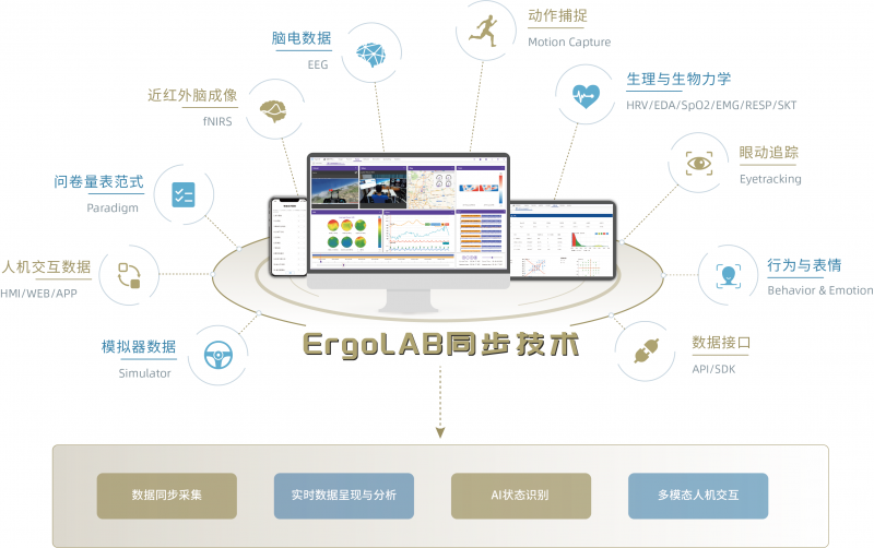 ErgoLAB人机环境同步平台采用主客观结合多模态数据同步采集与多维度验证的方法,数据实时同步种类包含大脑认知数据(EEG/BCI脑电仪与脑机接口边缘计算设备、fNIRS/BCI近红外脑成像仪),视觉数据(Eyetracker眼动仪与视线交互系统),生理数据(生理仪含:GSR/EDA、EMG、ECG、EOG、HRV、RESP、TEMP/SKT、PPG、SpO2),行为观察、肢体动作与面部表情(基本情绪、情绪效价、微表情等)数据、生物力学数据(拉力、握力、捏力、压力…),人机交互数据(包含人机界面交互行为数据以及对应的键盘操作,鼠标点击、悬浮、划入划出等;移动终端人机交互行为数据以及对应的手指轨迹操作行为如点击、缩放、滑动等;VR终端界面人机交互行为数据及对应的双手操作拾取、丢弃、控制,VR空间行走轨迹)、以及多类型时空行为轨迹数据采集(包括室内、户外、以及VR环境不同时空的行走轨迹、行车轨迹、访问状态以及视线交互、情感反应、交互操作行为等数据实时同步采集)、以及作业空间及作业环境数据(温度、湿度、噪音、光照、大气压、湿度、粉尘等)等客观量化数据;为科学研究及应用提供完整的数据指标。