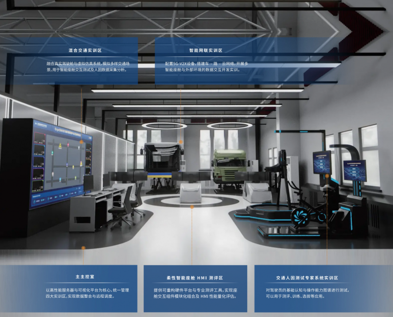 l 实训室环境搭建:混合交通实训区、智能网联实训区、柔性智能座舱HMI测评区、交通人因专家测试训练区、主控区等