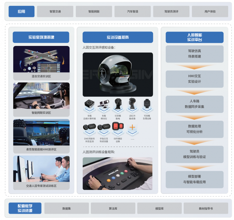 l 驾驶人因智能实训平台:驾驶仿真场景搭建、HMI交互实训设计、人车路数据同步采集、数据处理可视化分析、驾驶员模型训练与验证、模型部署与智能车载应用