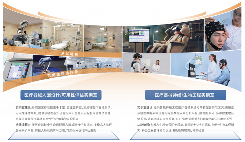 n 医疗器械人因设计/可用性评估实训室:实训室建设:参照国家标准搭建手术室、重症监护室、病房等医疗器械测试可用性评估场景、提供多模态感知设备矩阵和全套人因智能评估算法资源赋能各类型医疗器械可用性评估流程和体系;功能流程:对接医疗器械全生命周期形态器械进行任务搭建、多态人机环数据同步采集、智能人员状态实时监测、可用性分析和评估报告