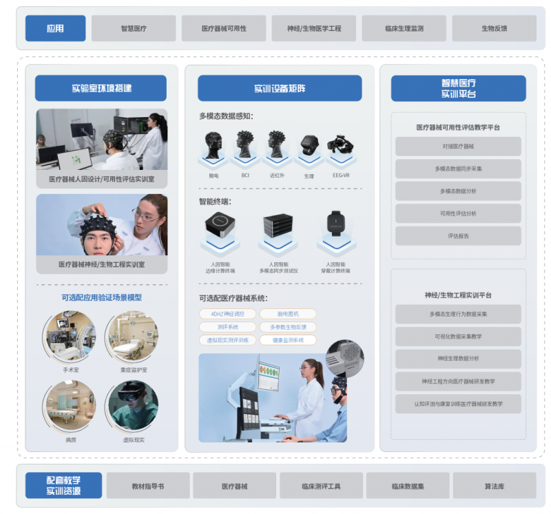 n 医疗器械神经/生物工程实训室:实训室建设:提供智能神经工程医疗器械系统矩阵和配套开发工具:高精度多模态数据采集设备矩阵及数据采集分析平台、脑电图系列、多参数生物反馈系列、认知测评与训练系列、40Hz神经调控系列、虚拟现实认知康复系列;功能流程:多模态生理信号同步采集、数据分析、特征提取、神经/生物工程研究、神经工程算法模型训练、模型部署应用、模型验证