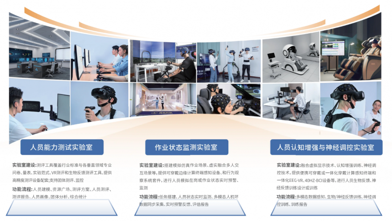 ErgoExpert®人员能力测评与训练实验室专注于人员核心胜任力建模、多模态测评与神经行为干预技术的科研与应用创新,面向各行业人员选拔训练、健康老龄化认知管理及人因安全等领域,构建覆盖“能力建模-多模态测评-神经反馈训练-人才画像”全链条的科研与产业化平台。实验室融合量表问卷主观测评、认知训练实验范式、VR测评训练方案、神经调控方案、行为分析与人工智能技术,为特殊岗位人员选拔、康复健康管理、作业状态监、神经调控与认知增强等场景提供科学评估与解决方案。