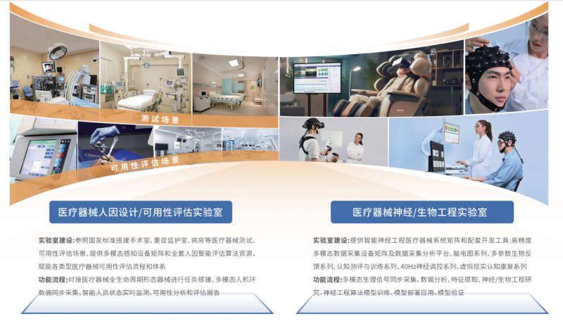 n 医疗器械人因设计/可用性评估实验室:实验室建设:参照国家标准搭建手术室、重症监护室、病房等医疗器械测试可用性评估场景、提供多模态感知设备矩阵和全套人因智能评估算法资源赋能各类型医疗器械可用性评估流程和体系;功能流程:对接医疗器械全生命周期形态器械进行任务搭建、多态人机环数据同步采集、智能人员状态实时监测、可用性分析和评估报告