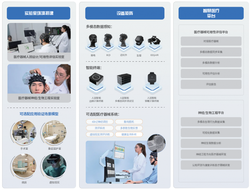 n 医疗器械神经/生物工程实验室:实验室建设:提供智能神经工程医疗器械系统矩阵和配套开发工具:高精度多模态数据采集设备矩阵及数据采集分析平台、脑电图系列、多参数生物反馈系列、认知测评与训练系列、40Hz神经调控系列、虚拟现实认知康复系列;功能流程:多模态生理信号同步采集、数据分析、特征提取、神经/生物工程研究、神经工程算法模型训练、模型部署应用、模型验证